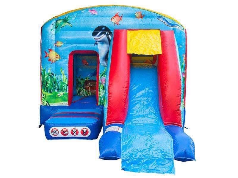 Hire this bouncy castle slide combination unit themed under the sea. This castle is 12 foot wide by 18 foot long & 10 foot high, so suitable for most halls.