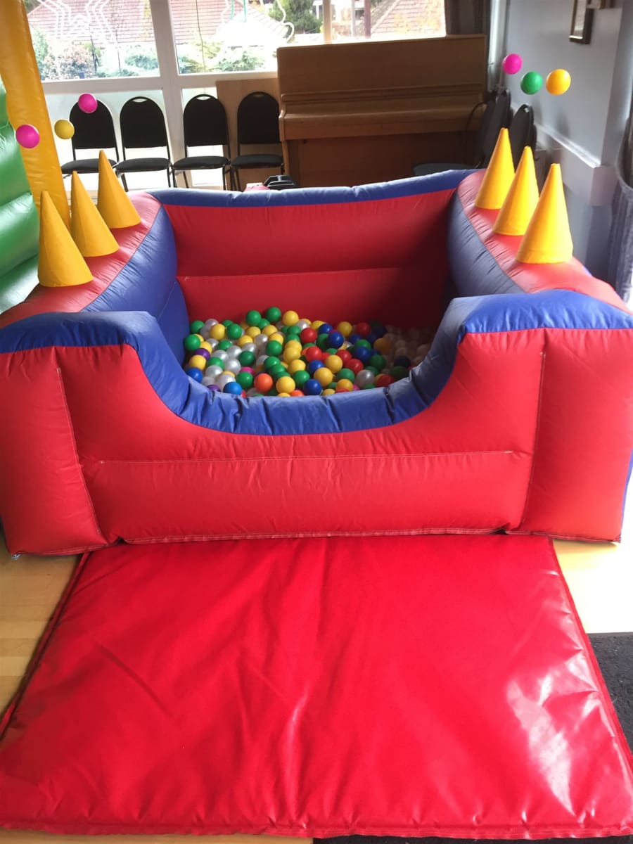 Red & blue ball pool with 3 air jugglers on each side that your toddlers float balls via the air blowing out to balance.