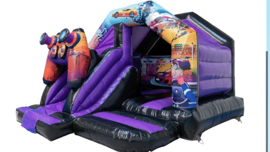 Rev up the excitement with our Ultimate Gaming Bouncy Castle with Slide! Perfect for any gaming enthusiast's party, this vibrant inflatable features dynamic race car graphics and bold colours that will transport kids into a thrilling racing world. The sleek purple and black design, accented with eye-catching automotive imagery, ensures this bouncy castle will be the centrepiece of any event.