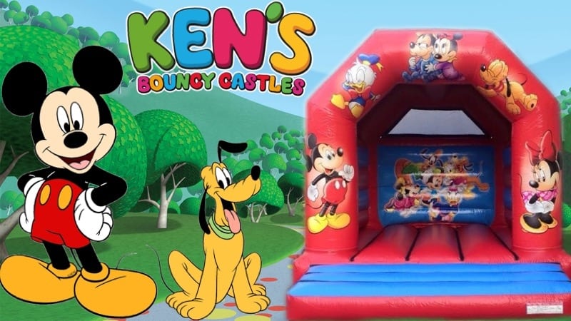 A lovely bright Disney bouncy castle with great artwork, showing Mickey, Minnie, Donald, Pluto, Goofy and kids.