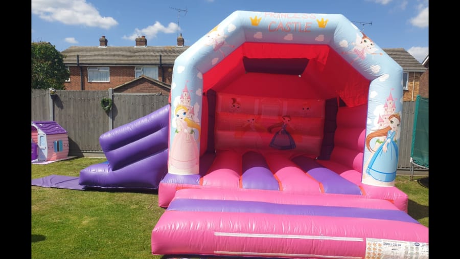 A beautiful pink & purple princess bouncy castle with side slide.