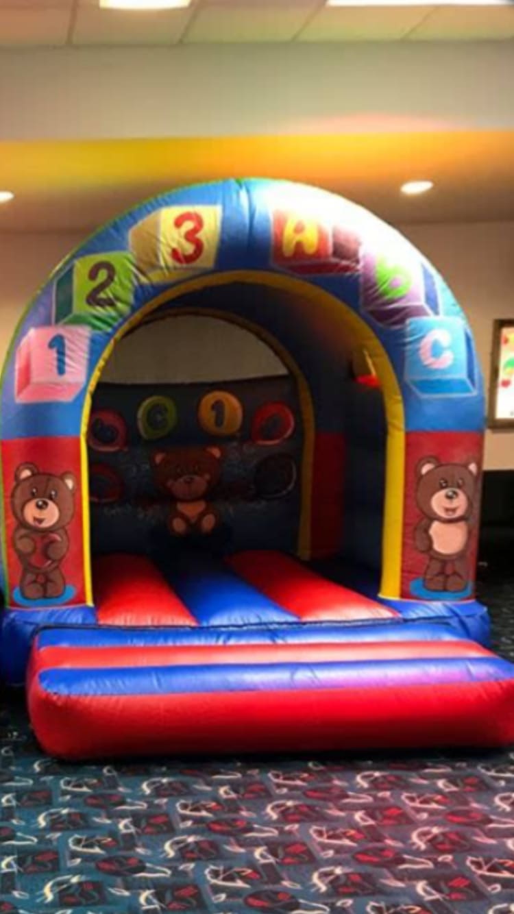 Teddy bear and ABC themed bouncy castle with rain cover, being suitable for both boys and girl toddlers parties.