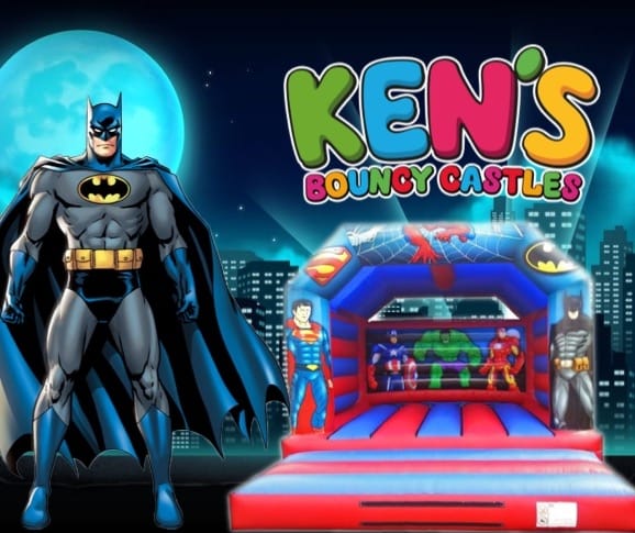 The bouncy castle shows Spider Man, Batman, Superman, Hulk, Captain America and Iron Man.