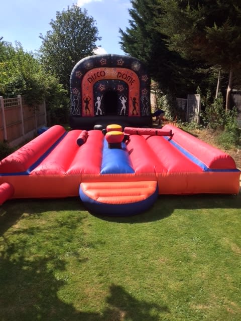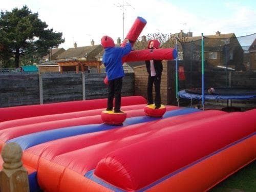 Inflatable bed is 17 x 23 foot in size. Head gear and gladiator fighting sticks are also included.